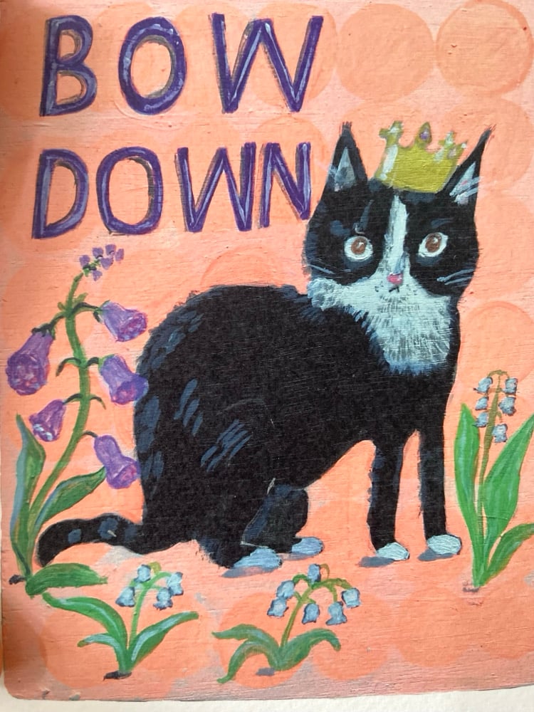 This print features a black and white tuxedo type cat wearing a crown and the wording Bow Down.