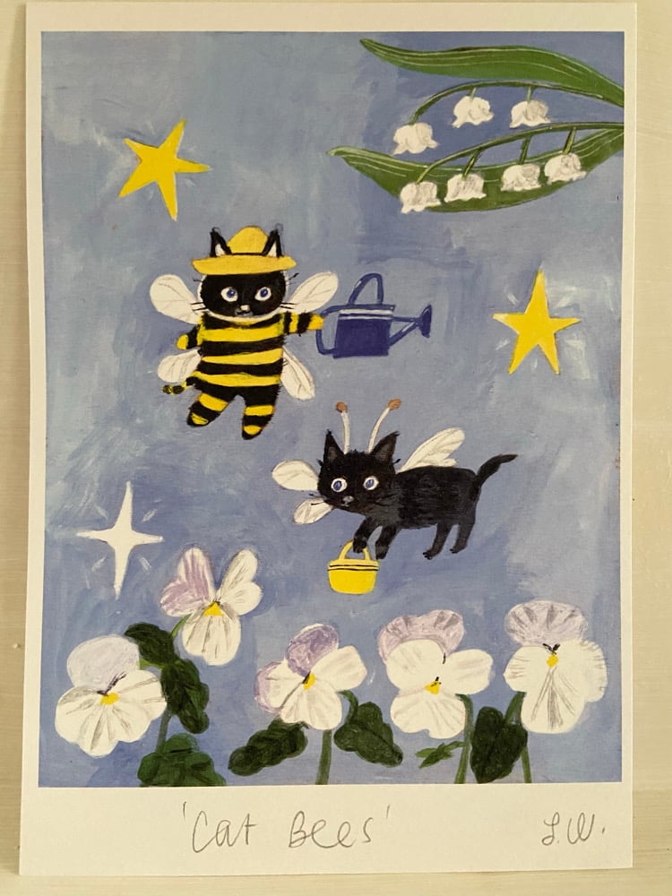 A5 print taken from an original painting by Sally Welchman aka moggshop and featuring some cat bees busy in the garden.