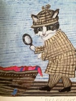 The artwork features two cats dressed up as Sherlock Holmes looking for their lost chicken toys.